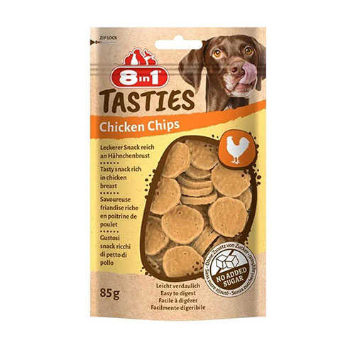 8in1 Tasties Chicken Chips, köpeğinizin karşı koyamayacağı lezzette ödül atıştırmalıklarıdır.