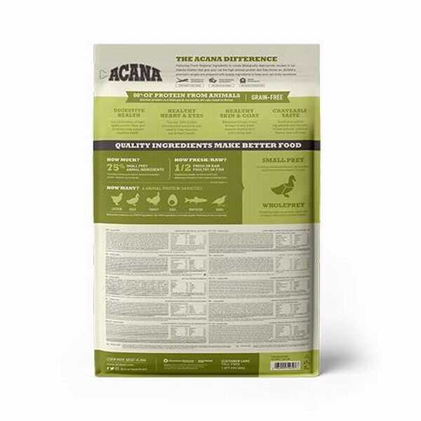 Taze ördek eti (11%), taze tavuk eti (11%), taze gezen tavuk yumurtası (8%), suyu alınmış tavuk eti (7%), suyu alınmış hindi eti (7%), suyu alınmış göl balığı (7%), bütün pinto fasulyeleri, bütün bezelye, taze hindi eti (6%), Ördek yağı (5%), bütün kırmızı mercimek, bütün nohut, bütün yeşil mercimek, çiğ bıldırcın eti (4%), taze tavuk sakatatları (karaciğer, kalp) (2%), kömür balığı yağı (2%), taze hindi sakatatları (karaciğer, kalp) (2%), mercimek lifi, suyu alınmış ördek eti (1%), ördek karaciğeri (1%), ördek kıkırdağı (0.5%), dondurularak kurutulmuş tavuk ve hindi karaciğeri (0.5%), kurutulmuş yosun, taze bütün kabak, taze bütün balkabağı, taze kara lahana, taze ıspanak, taze şalgam yaprakları, taze havuç, taze elma, taze armut, taze bütün kızılcık, taze bütün yaban mersini, hindiba kökü, zerdeçal kökü, devedikeni, dulavratotu kökü, lavanta, hatmi kökü, kuşburnu.