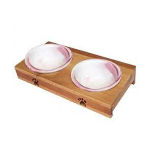 EuroGold Ahşap Sehpalı İkili Seramik Kedi ve Küçük Irk Köpek Mama ve Su Kabı 12cm 2x200 Ml Pembe