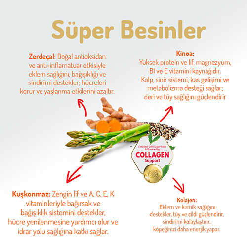 Alerjik reasksiyonlarla ilişkili olan sığır eti, süt ürünleri, buğday, soya, patates, yapay tatlandırıcı, renklendirici, kimyasal aroma ve GDO içermez!