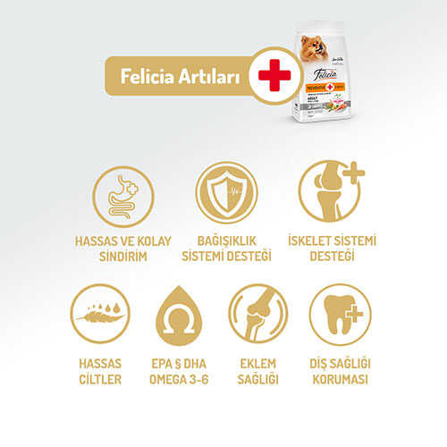 • Küçük ırk köpekler eklem problemlerine yatkın oldukları için, Felicia Mini Adult Salmon, yüksek oranda glukozamin ve kondroitin ile zenginleştirilmiştir.