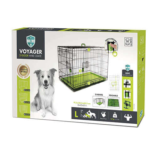 M-Pets Voyager 2 Kapılı Köpek Kafesi Large Yeşil, büyük ırk ve güçlü yapıya sahip köpekler için tasarlanmış, sağlamlığı ve güvenliğiyle öne çıkan profesyonel bir tel köpek kafesi modelidir. Patentli SECURO kilit sistemi, tek elle kolayca açılabilen yapısı sayesinde kullanıcıya pratiklik sunarken, zeki köpeklerin kafesi açmasını önleyerek maksimum güvenlik sağlar.