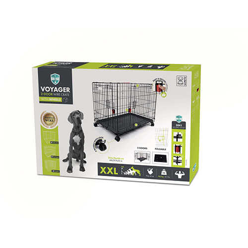 M-Pets Voyager Tekerlekli 2 Kapılı Köpek Kafesi XXLarge, çok büyük ve güçlü ırk köpekler için özel olarak tasarlanmış, güvenlik, dayanıklılık ve taşınabilirliği bir araya getiren profesyonel bir tel kafes çözümüdür. Patentli SECURO kilit sistemi ve kilitlenebilir tekerlekleri sayesinde hem ev içinde hem de seyahatlerde maksimum kontrol ve kullanım kolaylığı sağlar. Akıllı köpeklerin açamayacağı bu özel kilit, tek elle pratik şekilde açılıp kapatılabilir.