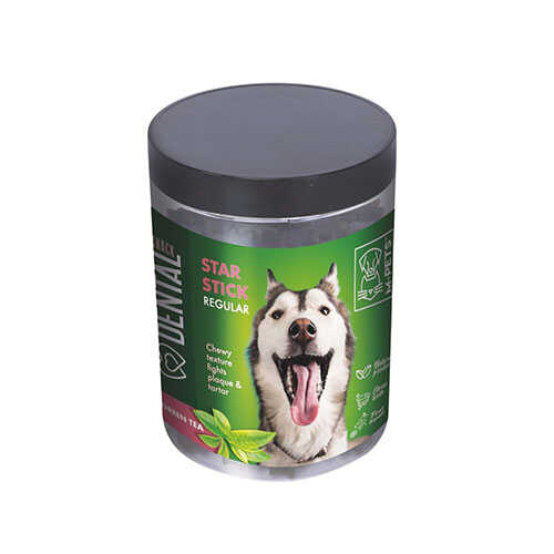 Yeşil çaylı köpek diş ödülü, köpekler için dental çiğneme çubuğu, ağız kokusu giderici köpek ödülü ve plak önleyici köpek atıştırmalığı arayanlar için etkili bir çözümdür. Yıldız şeklindeki yapısı, klasik düz çubuklara kıyasla diş aralarına daha iyi ulaşarak mekanik temizlik sağlar.