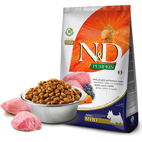 Kuzu, balkabağı ve yaban mersini. Yetişkin köpekler için formüle edilmiş tam mamadır.
