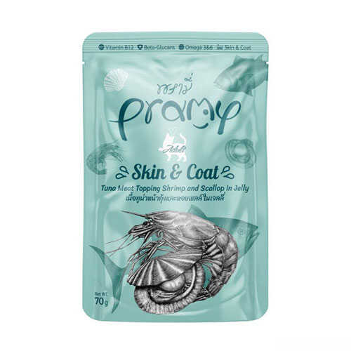 Pramy Skin Coat Jöle İçinde Karidesli Deniz Taraklı ve Ton Balıklı Yetişkin Kedi Konservesi 70 Gr