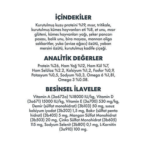 Kurutulmuş kuzu proteini %19, mısır, tritikale, kurutulmuş kümes hayvanları eti %8, et unu, mısır glüteni, kümes hayvanları yağı, şeker pancarı posası, balık unu, bira mayası, mannan oligosakkaritler, yuka (avize ağacı) özütü, yaban mersini özütü, kurutulmuş kadife çiçeği.