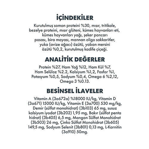 Kurutulmuş somon proteini %30, mısır, tritikale, bezelye proteini, mısır glüteni, kümes hayvanları eti, kümes hayvanları yağı, şeker pancarı posası, bira mayası, mannan oligosakkaritler, yuka (avize ağacı) özütü, yaban mersini özütü %0,2, kurutulmuş kadife çiçeği.