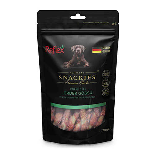 Reflex Snackies Natural Brokolili Ördek Göğsü Tahılsız Köpek Ödül Çubuğu ile köpeğinize sağlıklı, lezzetli ve besleyici bir ödül verin!